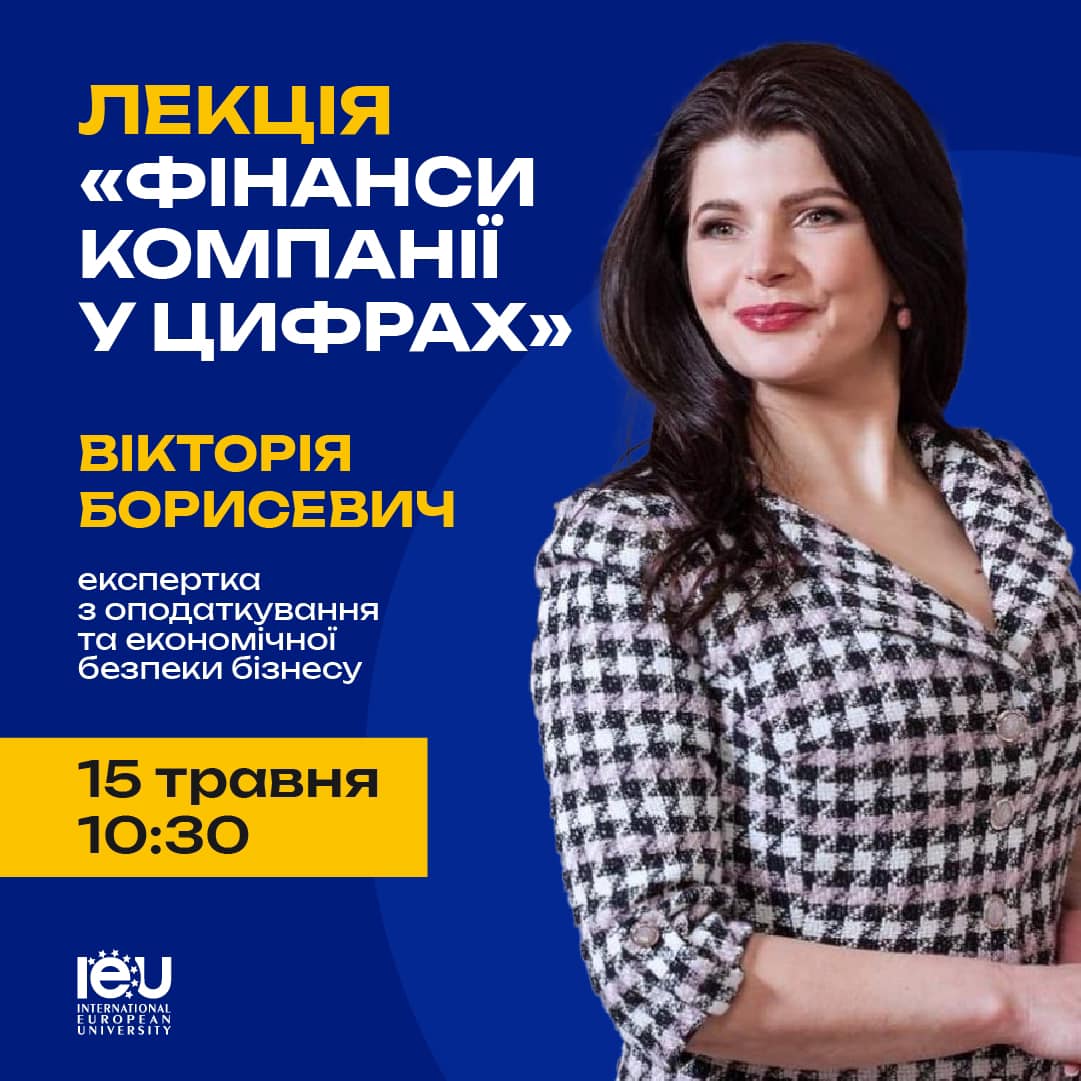 У рамках вивчення дисципліни «Облік і аудит» відбудеться гостьова лекція на тему «Фінанси компанії у цифрах», яку проведе Борисевич Вікторія — головна бухгалтерка групи компаній з різними системами оподаткування ТОВ “Родинне Джерело”, медичного центру IVMED, експертка з оподаткування та економічної безпеки бізнесу, фінансова консультантка з реальним досвідом роботи.