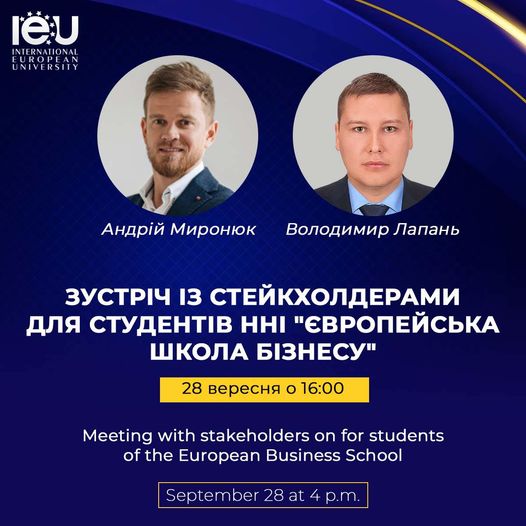 Запрошуємо всіх студентів ННІ "Європейська школа бізнесу" на захопливу зустріч із стейкхолдерами, яка відбудеться 28 вересня о 16:00 в Міжнародному Європейському Університеті.